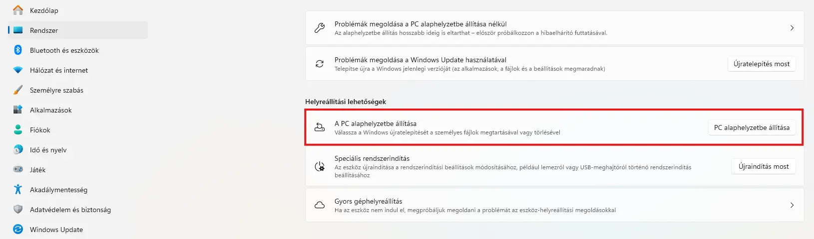 A legegyszerűbb módszer: Windows > Gép alaphelyzetbe állítása